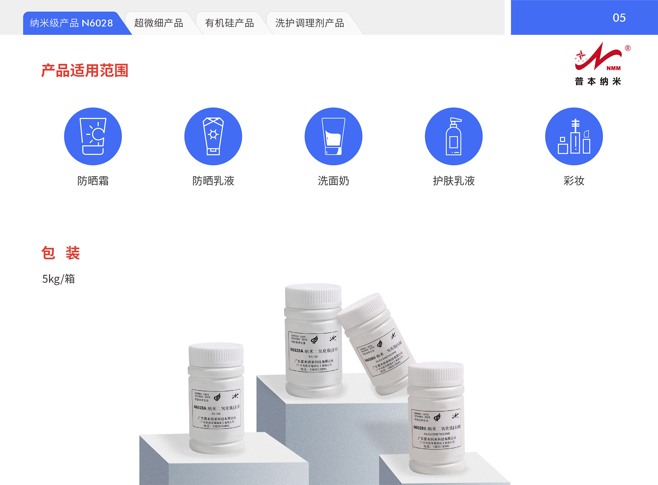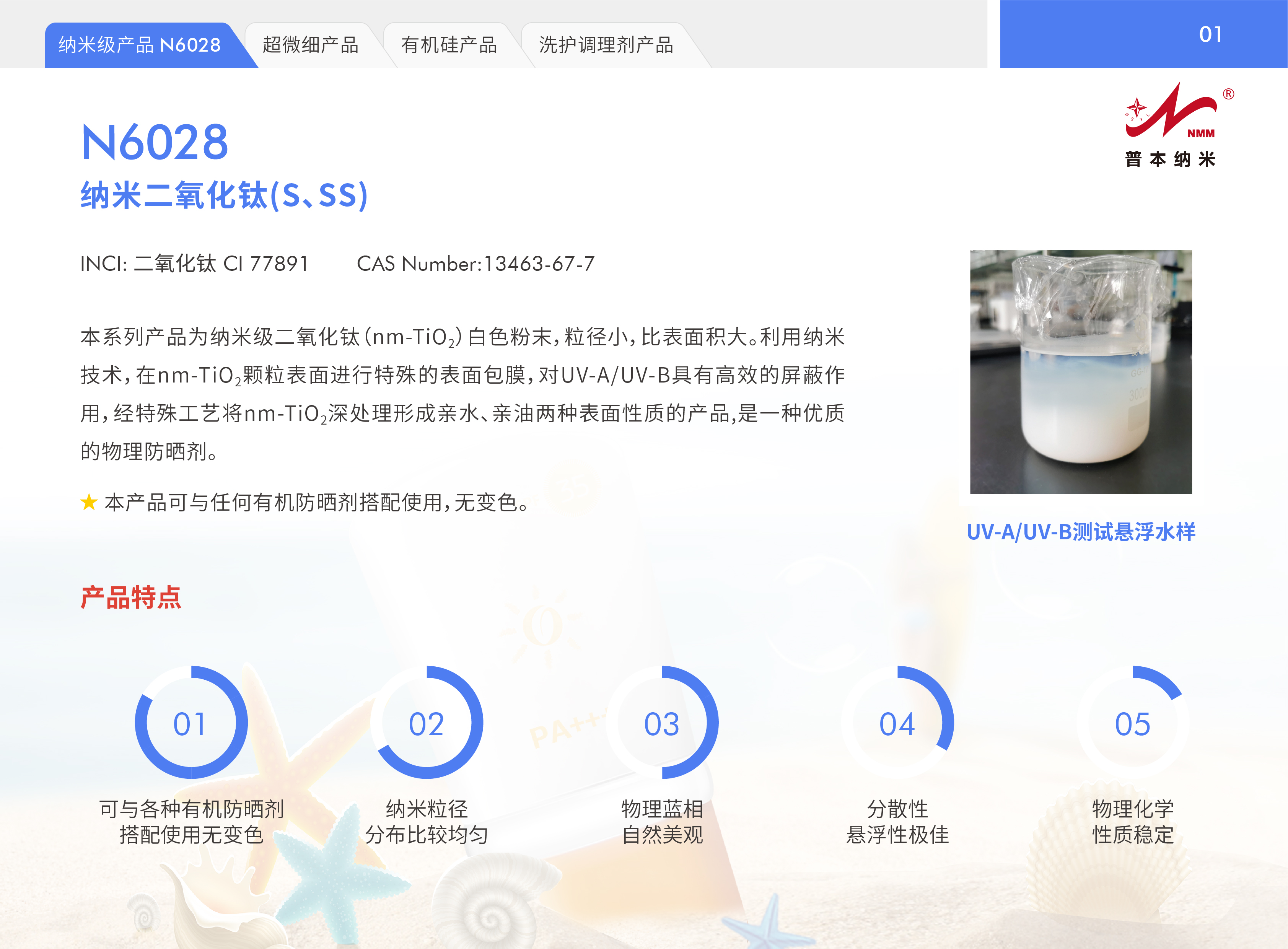 颗粒表面进行特殊的表面包膜,对UV-A/UV-B具有高效的屏蔽作用,经特殊工艺将nm-TiO