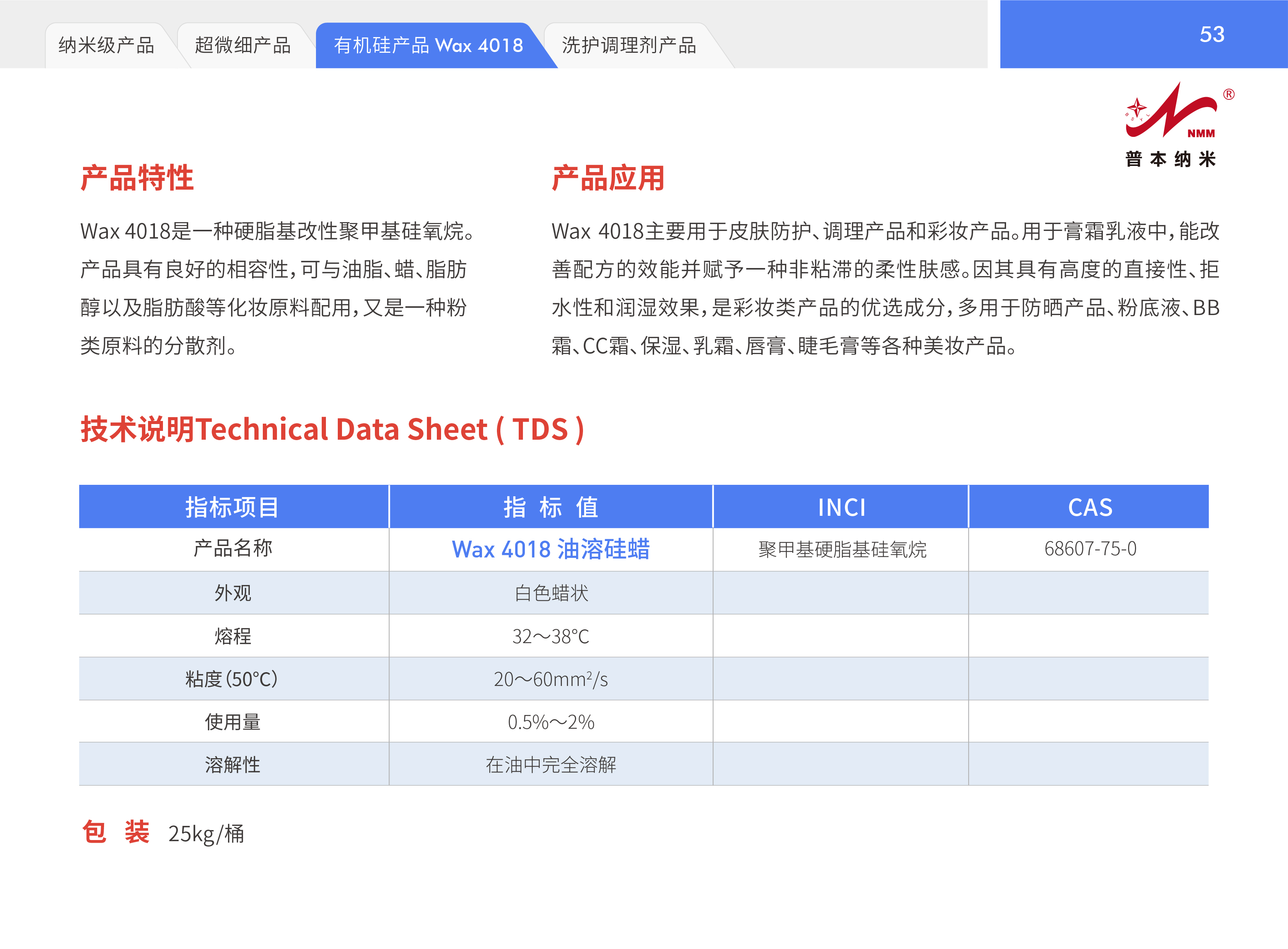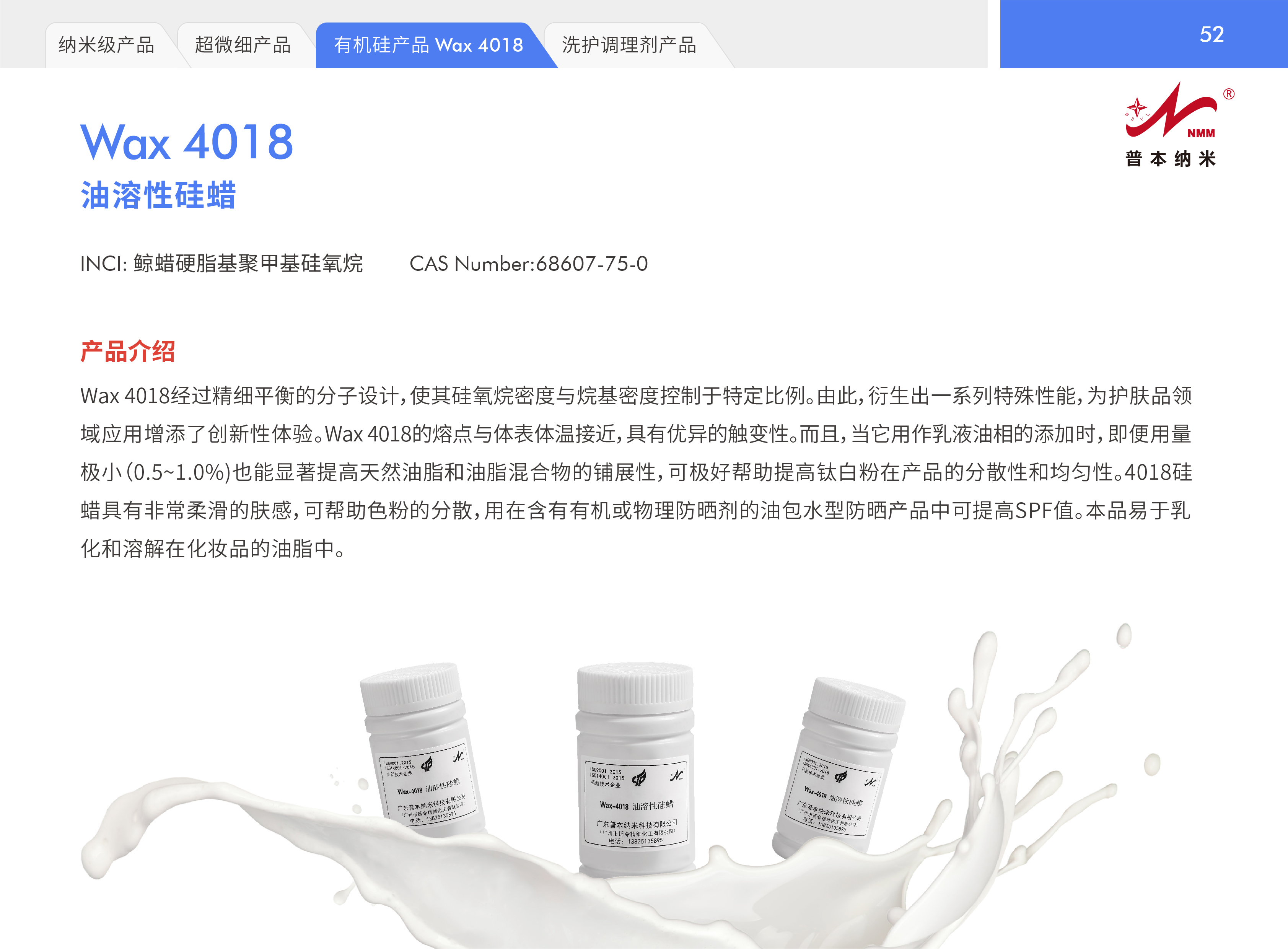 Wax 4018经过精细平衡的分子设计,使其硅氧烷密度与烷基密度控制于特定比例。由此,衍生出一系列特殊性能,为护肤品领域应用增添了创新性体验。Wax 4018的熔点与体表体温接近,具有优异的触变性。而且,当它用作乳液油相的添加时,即便用量极小(0.5~1.0%)也能显著提高天然油脂和油脂混合物的铺展性,可极好帮助提高钛白粉在产品的分散性和均匀性。4018硅蜡具有非常柔滑的肤感,可帮助色粉的分散,用在含有有机或物理防晒剂的油包水型防晒产品中可提高SPF值。 本品易于乳化和溶解在化妆品的油脂中。