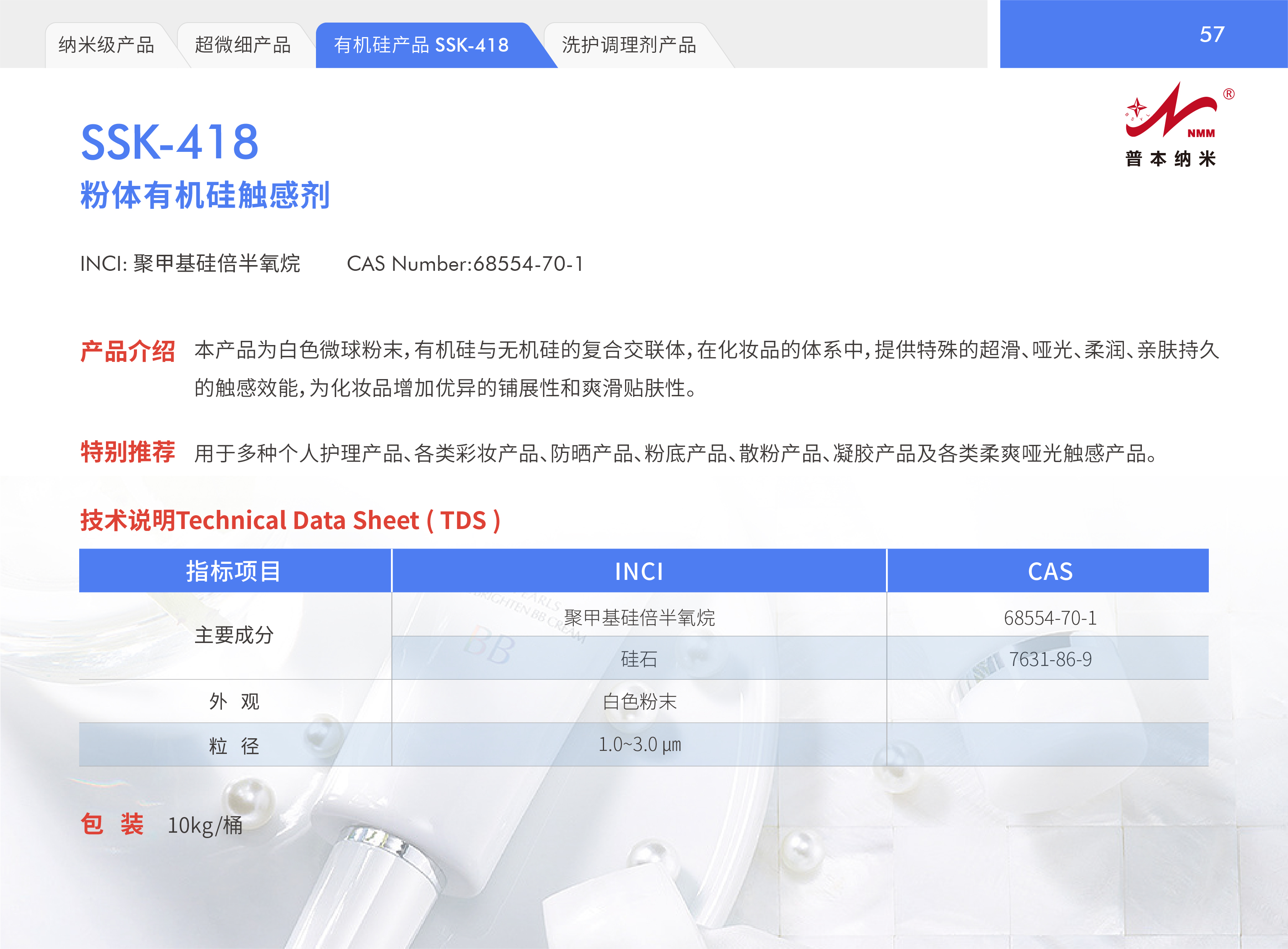 本产品为白色微球粉末,有机硅与无机硅的复合交联体,在化妆品的体系中,提供特殊的超滑、哑光、柔润、亲肤持久的触感效能,为化妆品增加优异的铺展性和爽滑贴肤性。