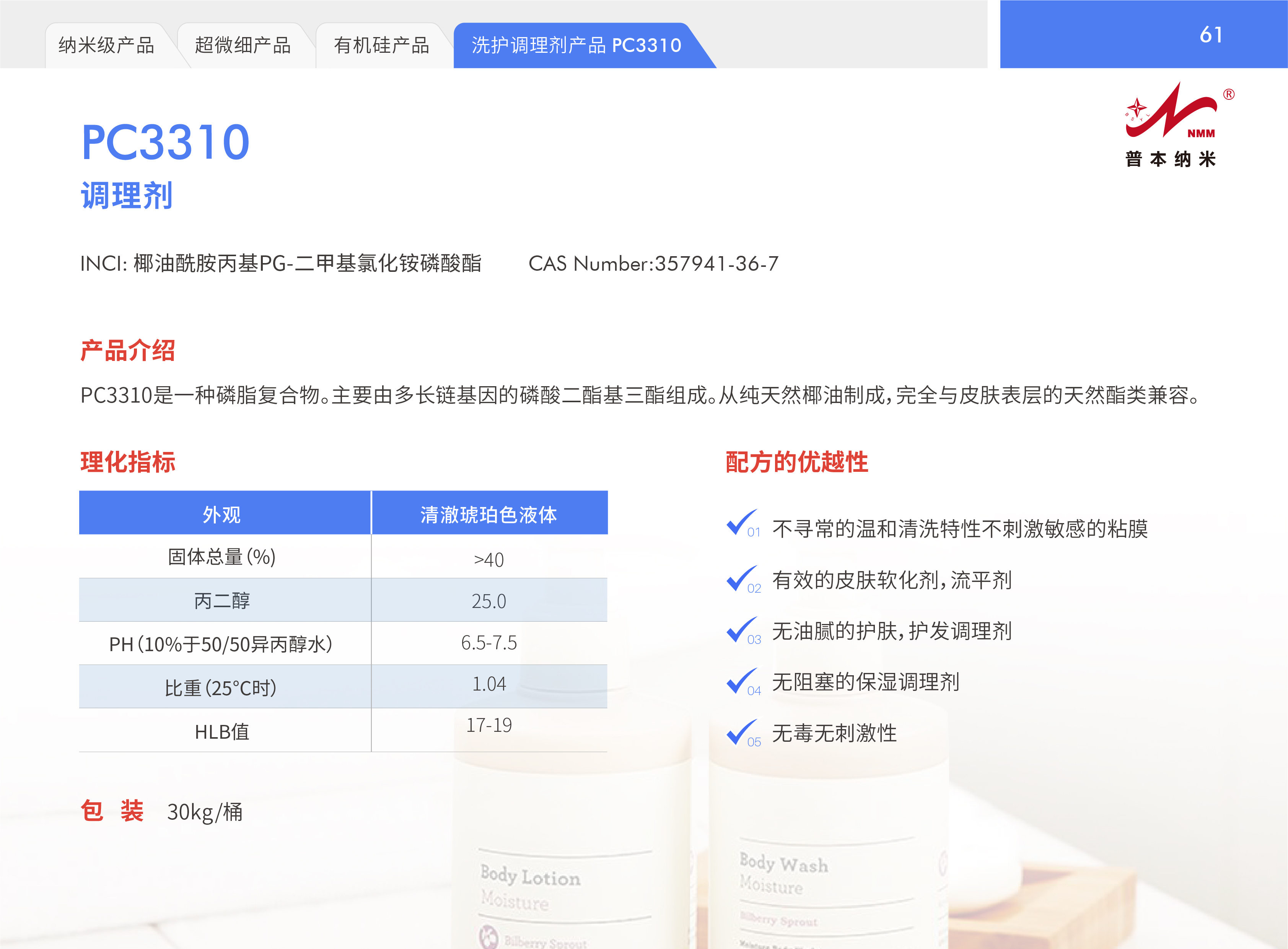 PC3310是一种磷脂复合物。主要由多长链基因的磷酸二酯基三酯组成。从纯天然椰油制成,完全与皮肤表层的天然酯类兼容。